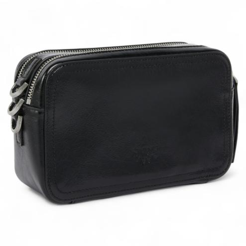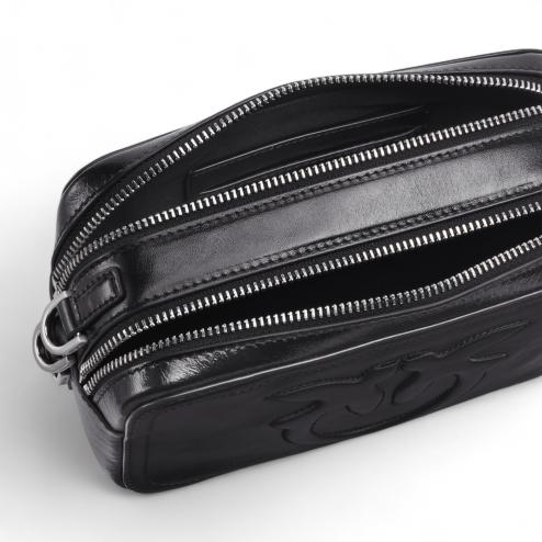 Borsa in pelle nera con finitura glossy, logo frontale in rilievo, chiusura con doppia zip, interno rivestito in drill di cotone nero, tasca interna porta carte. Tracolla rimovibile regolabile in pelle in tono con moschettoni colore argento.