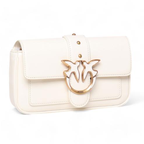Borsa clutch donna in pelle verniciata effetto vintage color avorio, iconica fibbia in metallo bronzo con uccellini Love Birds laccati in tono, tasca interna con zip, chiusura magnetica, interno foderato in cotone beige, applicazioni mini borchie bronzo, tracolla sottile in metallo bronzo.