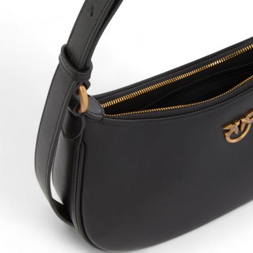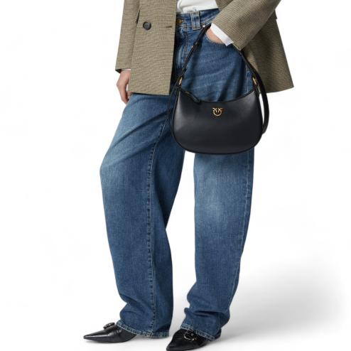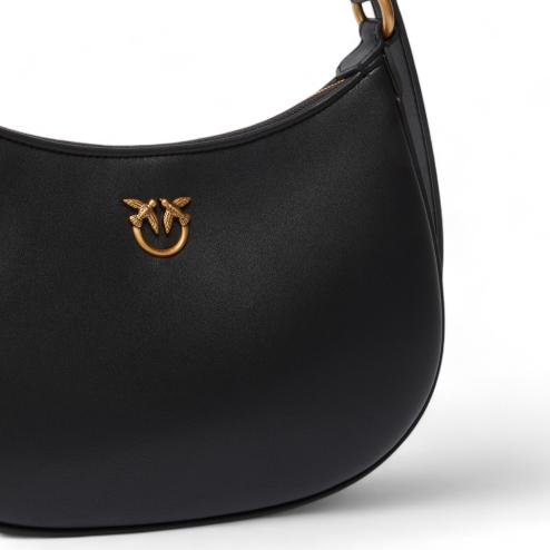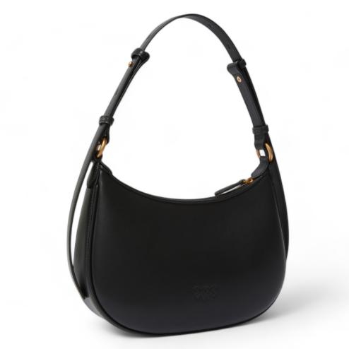 Borsa a spalla da donna in pelle mano seta nera con una particolare forma a mezzaluna. Interno foderato in microfibra scamosciata e tracolla removibile in pelle. Chiusura con cerniera.