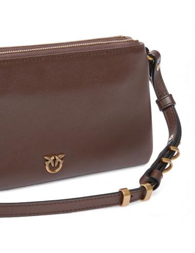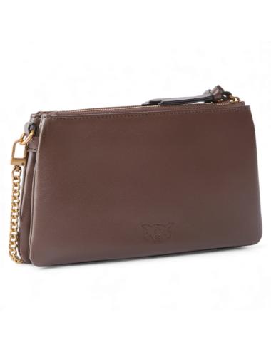 Dotata di doppia chiusura con zip e due scomparti interni, consente di organizzare al meglio gli oggetti essenziali. La tracolla regolabile e rimovibile in pelle e catena dorata permette di indossarla a spalla o crossbody, adattandosi a ogni occasione con versatilità e stile. Sul fronte, spicca il logo Love Birds in metallo dorato, simbolo distintivo dell’inconfondibile eleganza Pinko.