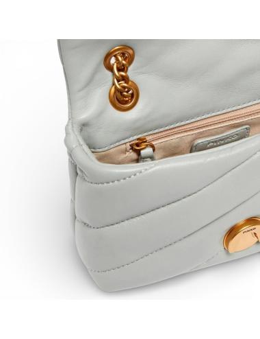Borsa da donna in morbida pelle nappa con trapuntatura diagonale elegante. Chiusura con fibbia Love Birds Diamond Cut, placcata in un raffinato oro anticato. Interno rivestito in microfibra scamosciata al tatto e comoda tasca con zip. Tracolla a catena in metallo con spallaccio in pelle.