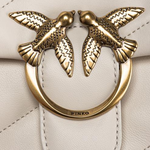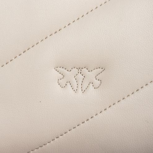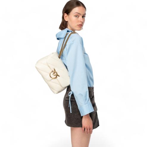 Pinko borsa puff bianca con tracolla, struttura in morbida pelle colore bianco seta, iconica fibbia in metallo color bronzo con uccellini Love Birds. Interno foderato in microfibra avorio, tasca interna centrale con zip, tracolla in metallo bronzo lunga 110 cm.