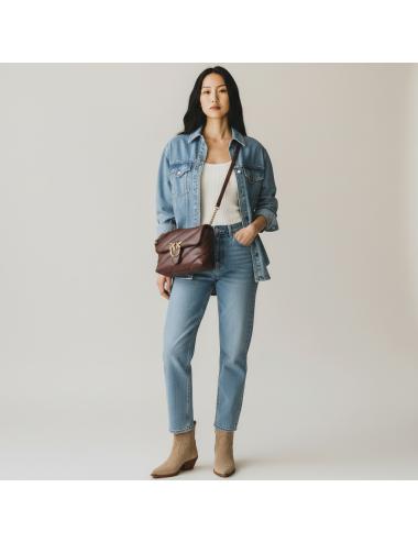 La pelle nappa color Burgundy Wine con maxi trapuntatura dona volume e presenza scenica. La chiusura con fibbia Love Birds Diamond Cut in metallo dorato è l’elemento signature che eleva immediatamente il look. La tracolla a catena scorrevole consente utilizzo a spalla o crossbody, adattandosi a daywear e eveningwear.