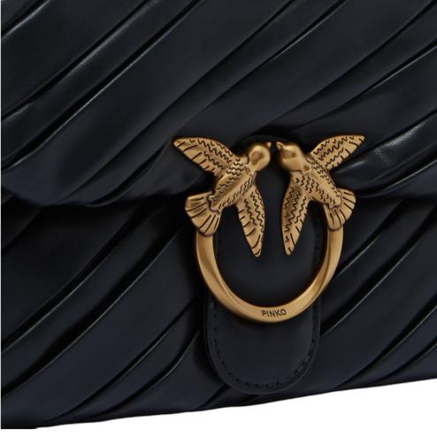 Borsa tracolla donna in tessuto riciclato effetto pelle con motivo plissé, iconica fibbia in metallo color bronzo con uccellini Love Birds. Interno foderato in microfibra, tasca interna, tracolla sottile a catena in metallo bronzo.