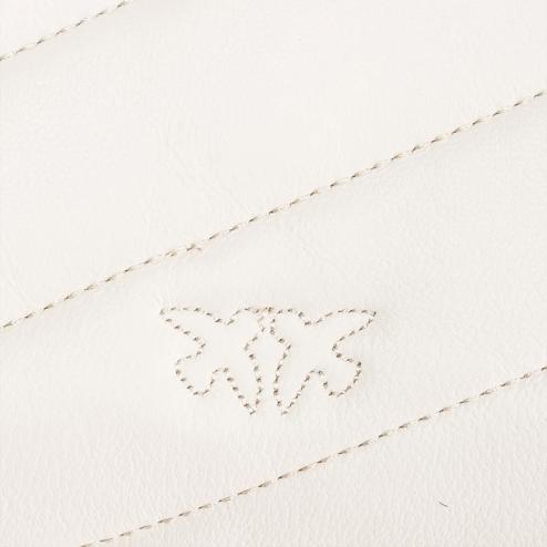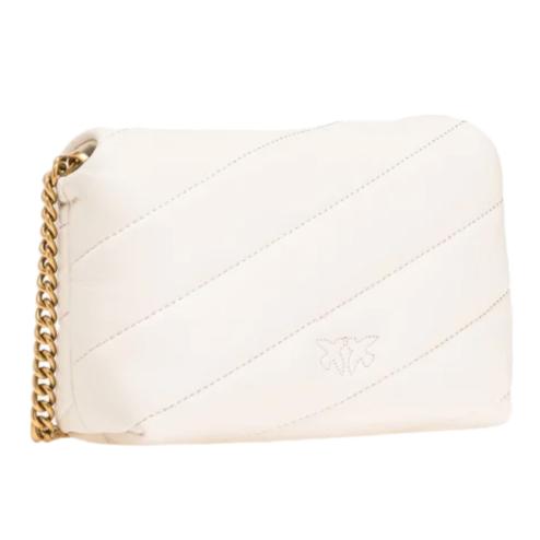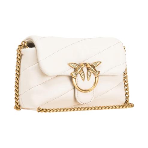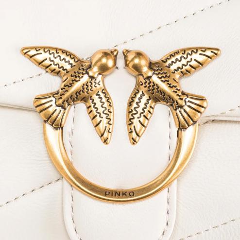 Tracolla piccola donna in morbida pelle colore avorio, iconica fibbia in metallo color bronzo con uccellini Love Birds. Interno foderato in microfibra beige, tasca interna, tracolla sottile a catena in metallo bronzo.