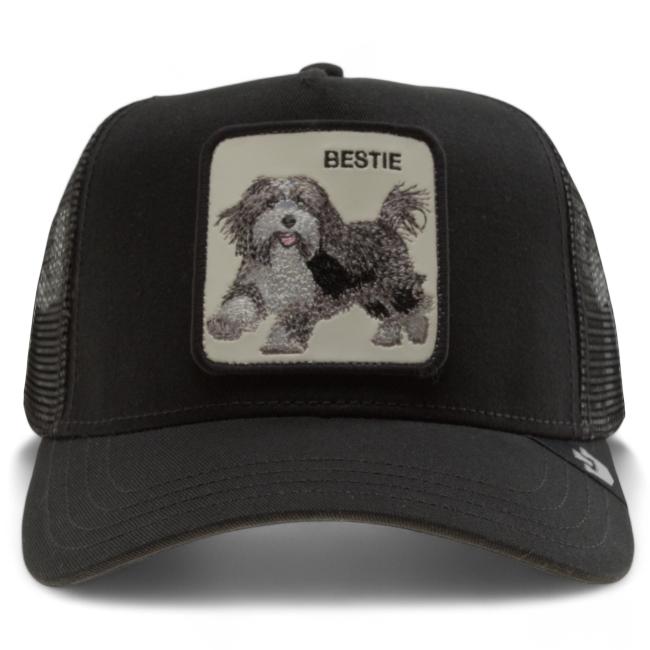 Cappello con visiera modello trucker in tessuto canvas nero, retina in tessuto tecnico nero, chiusura snapback, patch in pelle ricamata cane.