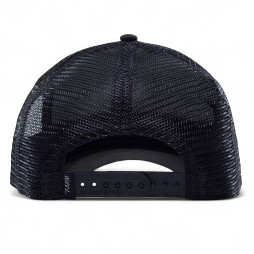 Cappello con visiera modello trucker in cotone nero con retina in tessuto tecnico nera, chiusura snapback, patch in pelle bianca Chiwawa "Amigo".