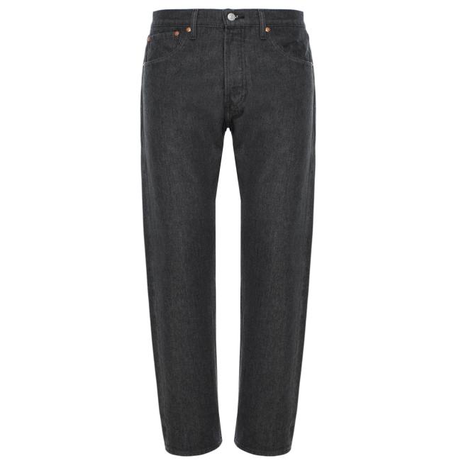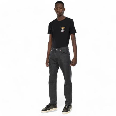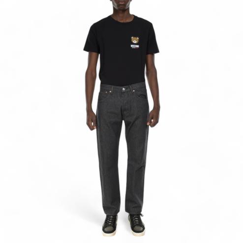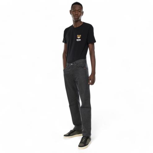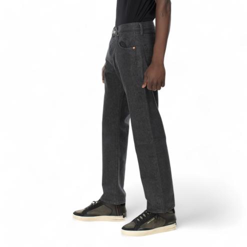 Denim da uomo lavaggio nero vintage, modello 5 tasche,chiusura con bottoni logati, salpa logata di colore cuoio, effetto rottura con toppa su entrambe le gambe.