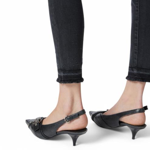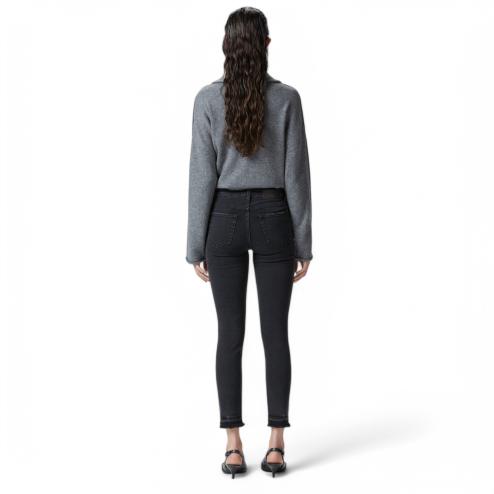 Vita mid-rise con passanti per cintura, gamba aderente e fondo tagliato al vivo, rifinito con trattamento a riserva per un effetto cromatico a contrasto. Chiusura con zip e bottone a chiodo in metallo.