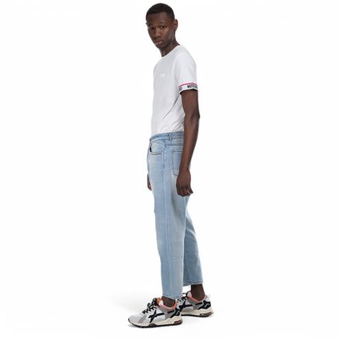 Jeans da uomo 5 tasche in denim lavaggio chiaro con rotture, con passanti per cintura, salpa in pelle sul retro e chiusura con bottoni in metallo. Presentano un cavallo morbido e una gamba che si restringe sul fondo per un fit moderno.