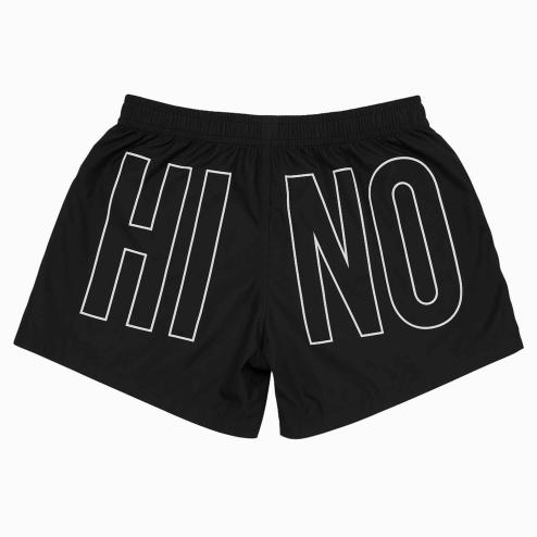 Costume da bagno uomo modello bermuda, tessuto tecnico di colore nero con logo bianco, elastico in vita con laccetti logati, retina interna.