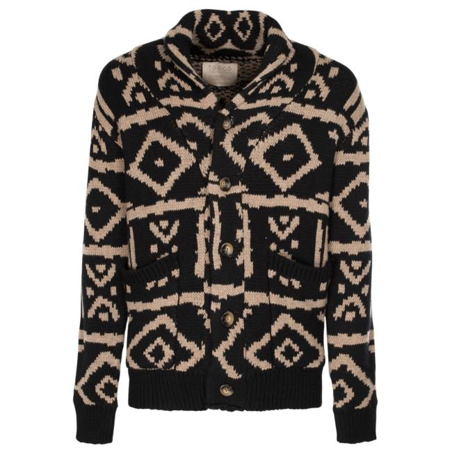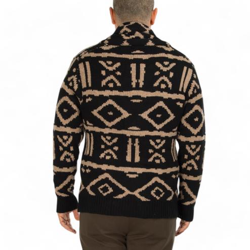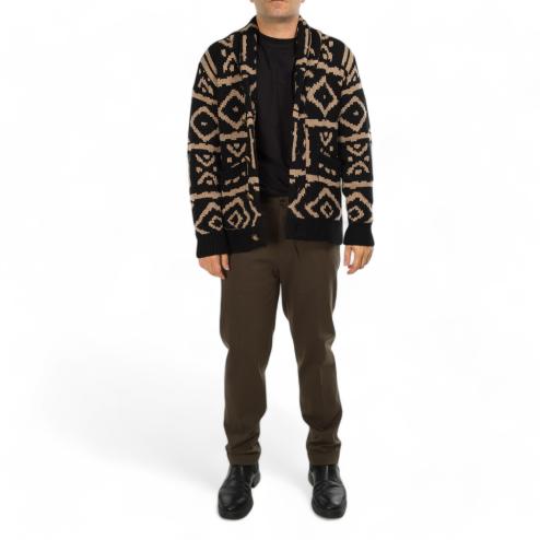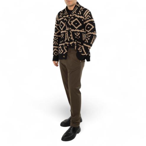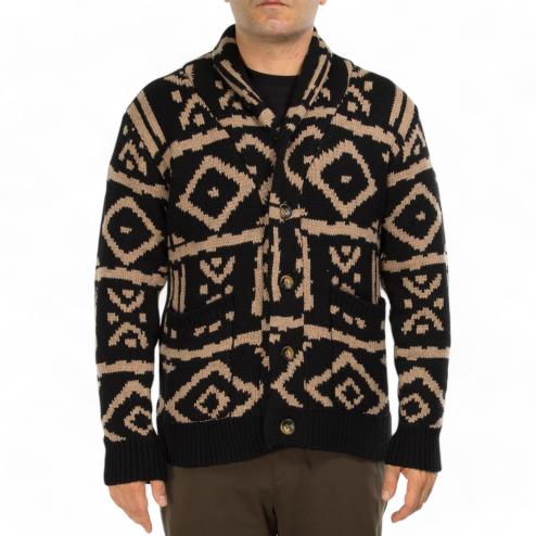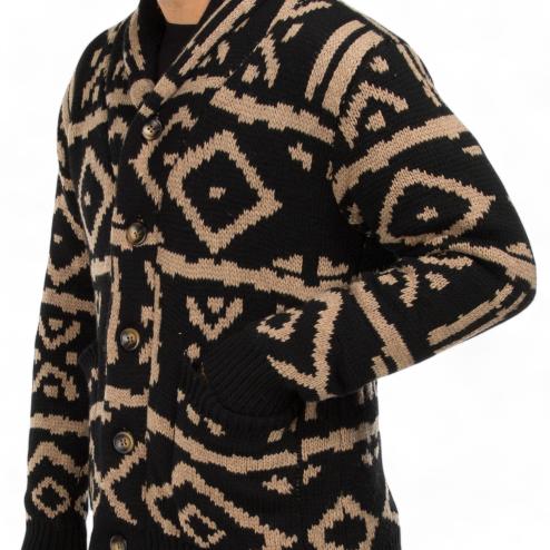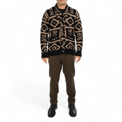 Cardigan da uomo in lana con bottoni a vista tasche e fondo maglia e polsini a costine, fantasia indie nero e beige.