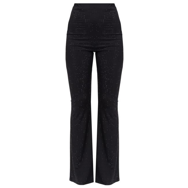 I pantaloni da donna presentano un design aderente e di colore nero, arricchito da diamantini neri che conferiscono un tocco di lusso al capo. Dotati di elastico in vita, assicurano una vestibilità confortevole e aderente. Il modello sfoggia una leggera svasatura sul fondo, aggiungendo un tocco di eleganza e versatilità al tuo guardaroba.