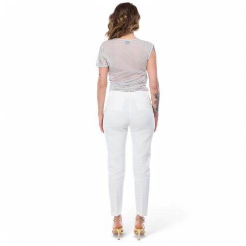 Pantalone bianco cigarette-fit in lino stretch con vita regular e passanti per cintura. Tasche alla francese davanti e a filetto sul retro, con dettaglio di piega al centro gamba sia davanti che sul retro. Chiusura con zip e piccolo gancio per una vestibilità impeccabile.