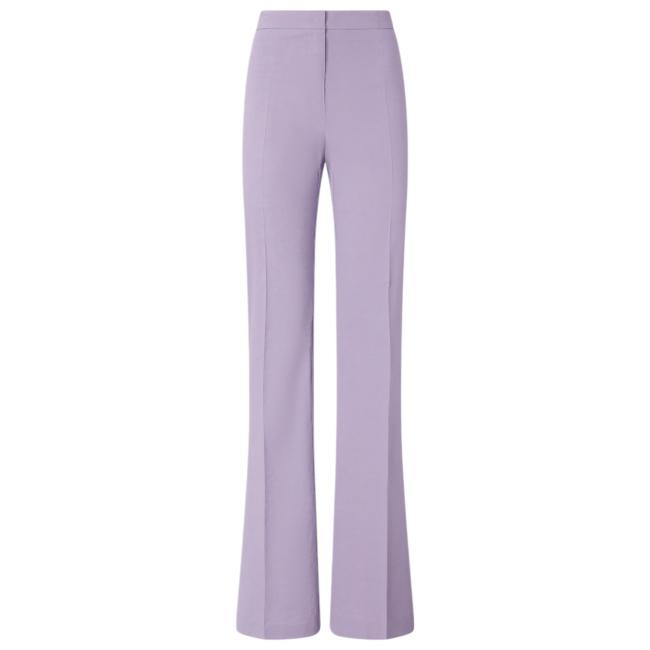 Pantaloni flare-fit in tessuto di lino stretch, caratterizzati da vita alta e gamba svasata con piega centrale. Chiusura con zip e piccolo gancio per una vestibilità comoda e raffinata.