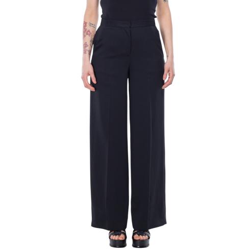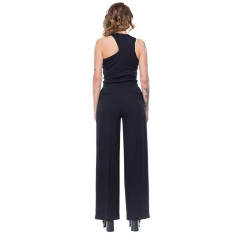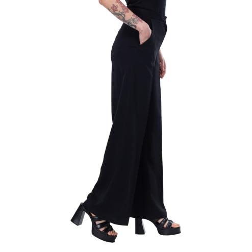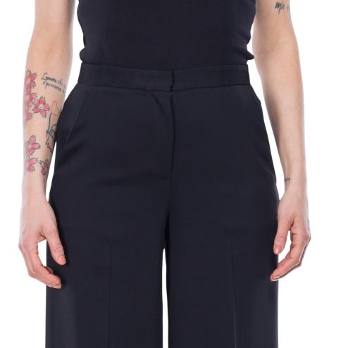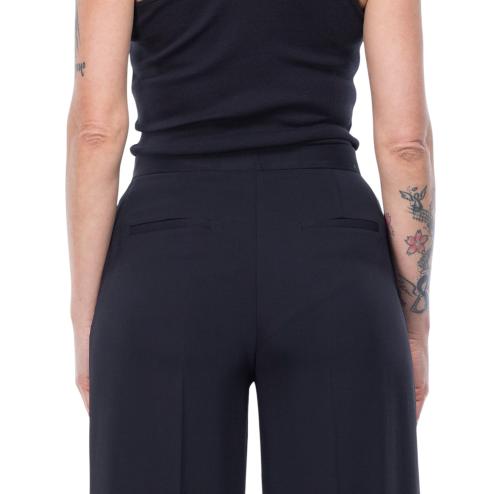 Pantalone nero elegante da donna in cady tecnico, un tessuto versatile e dal look raffinato. Tasche alla francese sui fianchi e tasche a filetto sul retro, chiusura con zip, arricchita da un gancio a scomparsa in vita. Gamba, ampia e dallo stile fluido caratterizzata da una piega centrale sia sul davanti che sul retro.