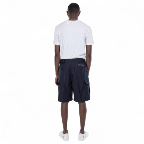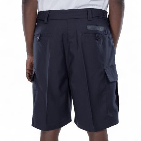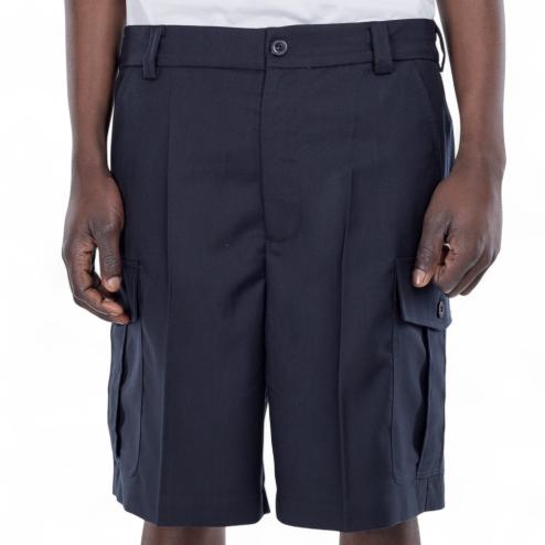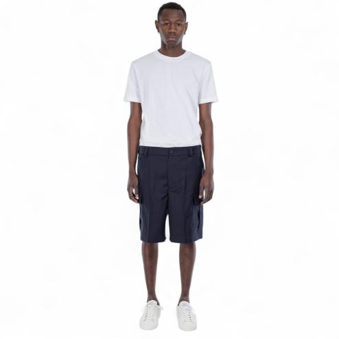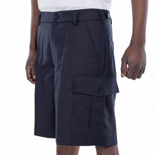 Pantalone bermuda cargo colore blu scuro con tipici tasconi laterali, passanti per cintura e chiusura con bottone a vista e cerniera coperta da patta.