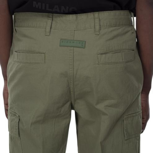 Pantalone in tessuto di cotone colore verde militare, modello cargo con tasche laterali gamba morbida.