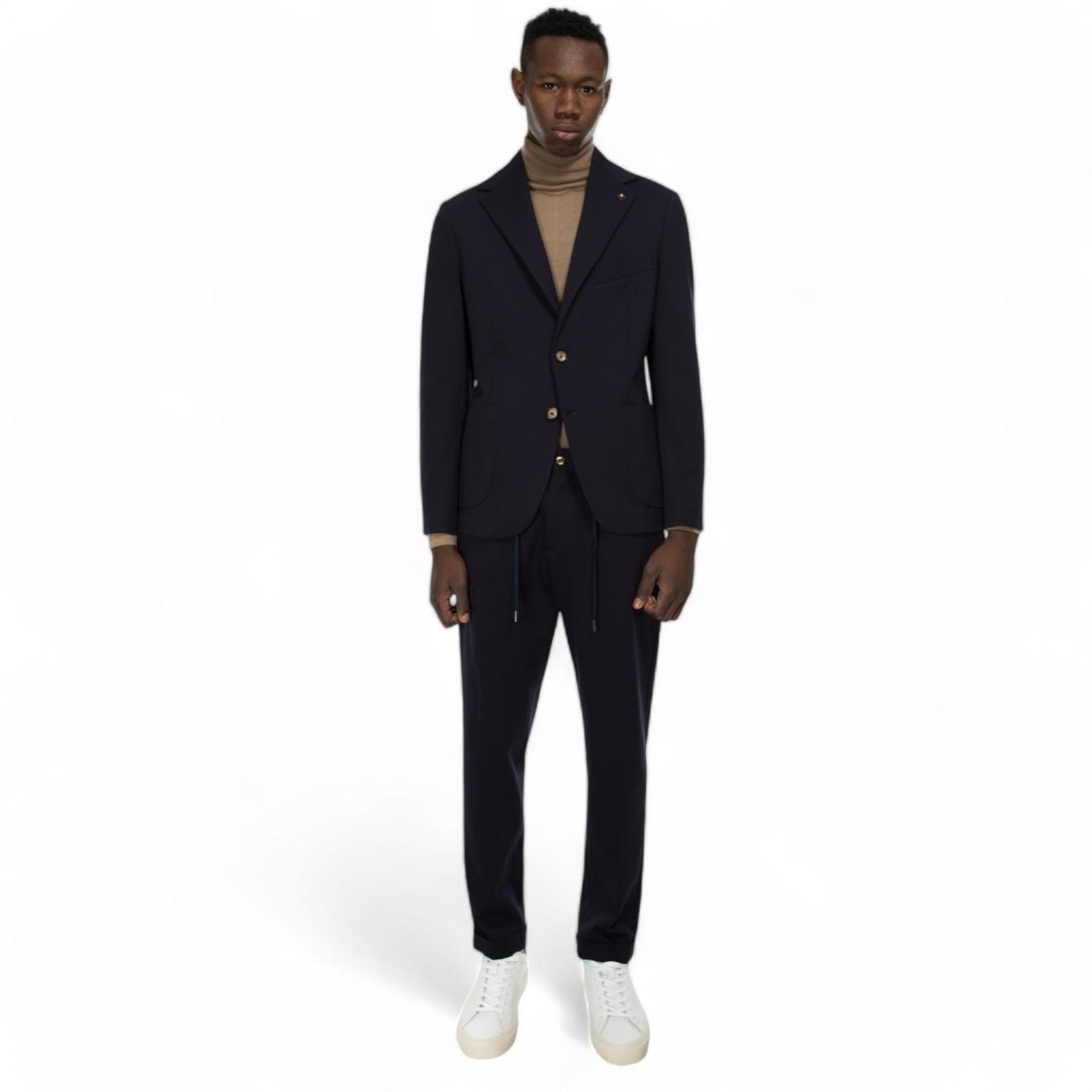 Pantalone da uomo due pinces in tessuto morbido colore blu, chiusura con bottone e cerniera, elastico posteriore, coulisse in vita, tasche a filo anteriori, tasche posteriori con patta.
