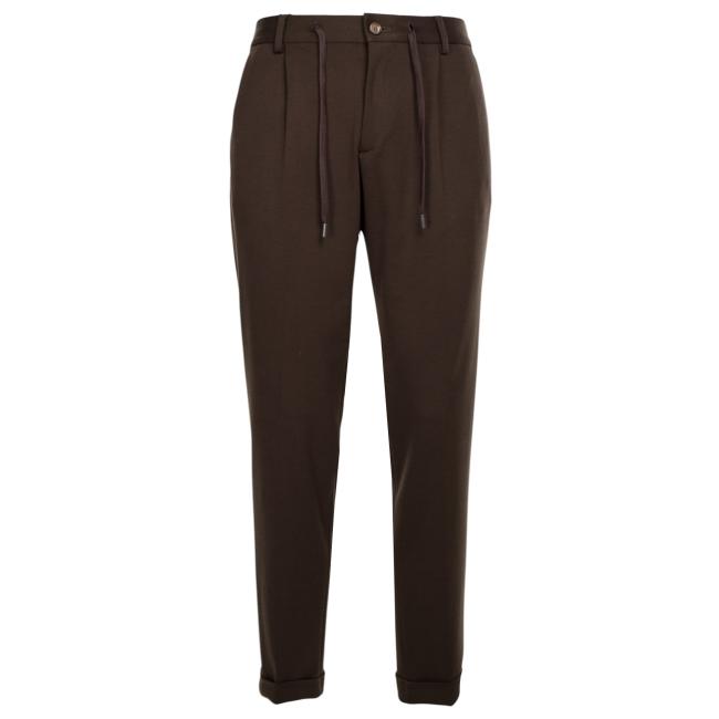 Pantaloni modello chinos colore marrone tasche a filo chiusura con bottone a vista e cerniera a scomparsa e laccetti in corda, elastico in vita,gamba morbida, 2 tasche sul retro con patta.