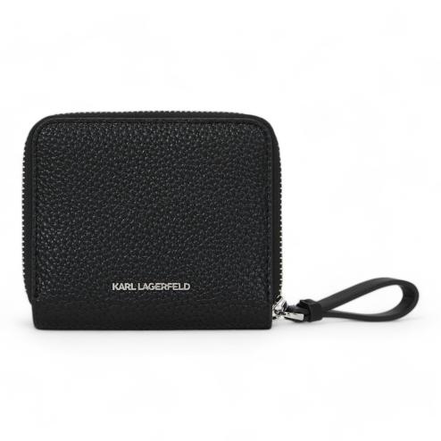 Portafoglio in ecopelle nera, chiusura con bottone automatico, scomparto portamonete con zip, tasche interne portacarte, logo Karl signature in rilievo.