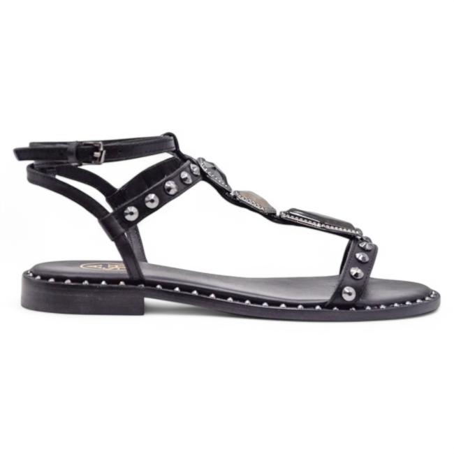 Ash Penny Sandali Bassi Borchiati Donna – Grinta e stile in un unico design. Realizzati in pelle nera, questi sandali si distinguono per le borchie coniche rivettate in metallo color piombo e le pietre grigie applicate, che donano un carattere deciso e sofisticato.