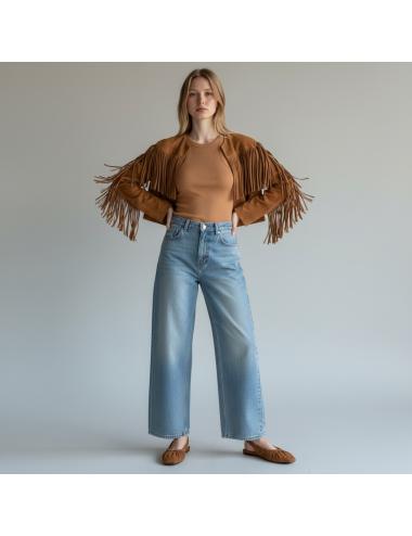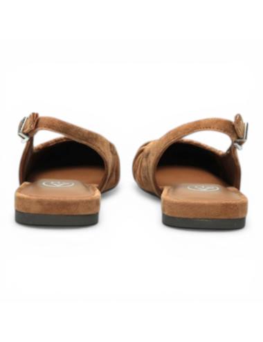 Realizzata in suede color cuoio, presenta una tomaia arricciata che dona movimento e un tocco distintivo al design. Il cinturino posteriore regolabile con fibbia assicura una calzata stabile e confortevole.