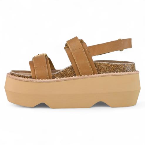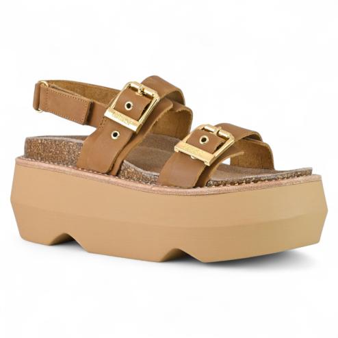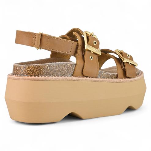 Sandali platform donna in cuoio naturale, doppia fibbia regolabile in metallo color oro, cinturino sul tallone regolabile con velcro, suola platform alta 8 cm in EVA ultra morbida, flessibile e antiscivolo, plantare interno in lattice mordido ergonomico rivestito in pelle scamosciata.