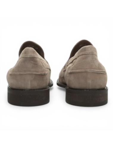 La tomaia in suede color fango dona profondità e carattere alla scarpa, mentre il design classico con mascherina frontale richiama la tradizione dei mocassini italiani reinterpretata in chiave moderna. Le cuciture artigianali valorizzano la linea pulita del modello.