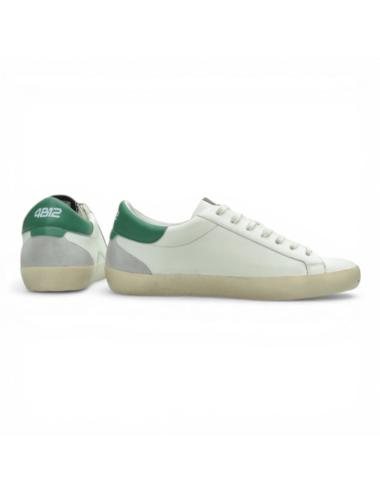 Sneakers uomo basse in pelle bianca effetto vintage, dettaglio laterale in pelle colore grigio, inserti in pelle sul tallone camoscio bianco e pelle verde foglia, para in gomma avorio effetto "used", etichetta in tessuto nero logato sulla linguetta, plantare interno removibile in lattice rialzato 2,5 cm e rivestito in pelle, rivestimento interno in spugna di cotone, lacci in tessuto bianco con stampa a contrasto nera.