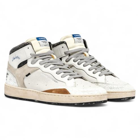 Le Chelsea Mid Chalk Asphalt reinterpretano il design sportivo rétro con un taglio mid-top urbano e grintoso. La tomaia combina suede beige e dettagli in pelle cracklé bianca e nera, mentre il colletto imbottito e il logo ricamato in blu aggiungono un contrasto originale. Il fondo in gomma beige effetto used completa il look street contemporaneo.