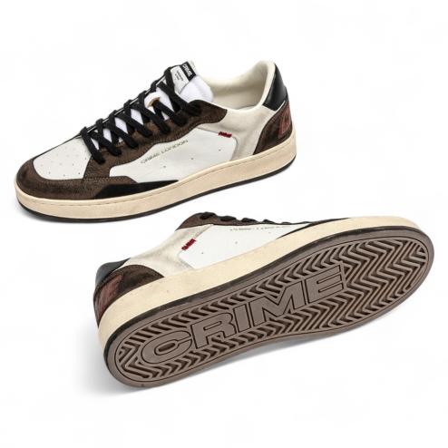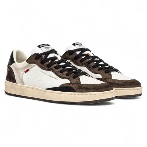 La tomaia bicolore combina bianco e marrone con finiture nere, arricchita da dettagli ricercati come il logo ricamato sul tallone. La suola in gomma effetto vintage assicura stabilità e durata, mantenendo uno stile intramontabile.