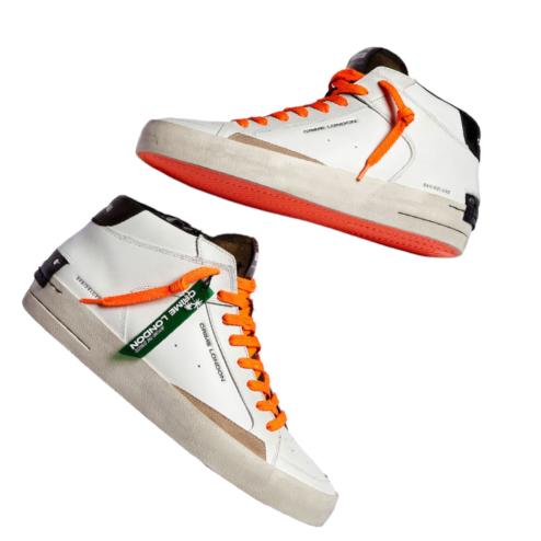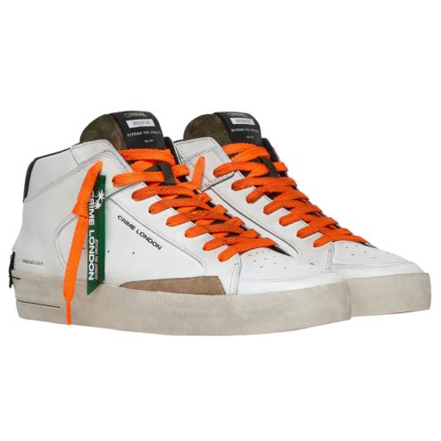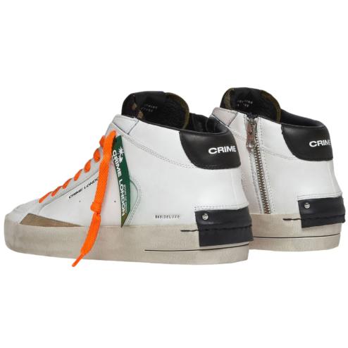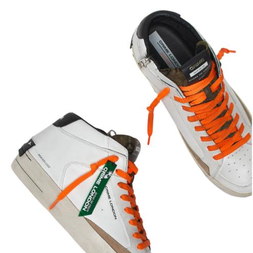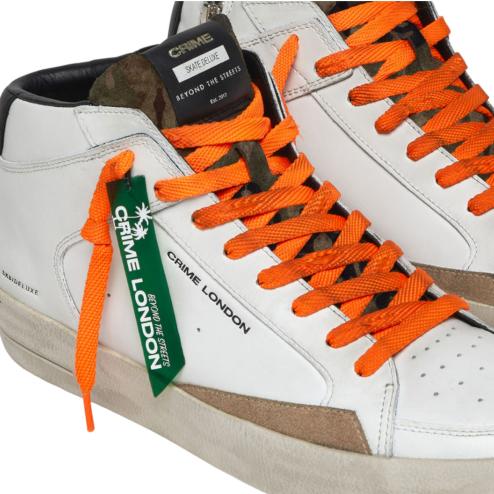 Sneakers alte da uomo in pelle bianca effetto vintage, dettagli in pelle scamosciata beige, para in gomma color avorio effetto used con dettaglio nero, lacci in cotone arancione fluo, dettaglio sul tallone in pelle nera, linguetta in pelle scamosciata con stampa camouflage, zip laterale interna, logo Crime sulla linguetta, plantare interno in lattice rialzato 2,5 cm.