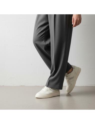 La tomaia in nappa color bianco panna è costruita con pannellature pulite e micro-forature sulla punta per una migliore traspirabilità. La label D.A.T.E. impressa sulla linguetta e il logo quadrato laterale definiscono l’identità del brand con un look sobrio e premium. Il talloncino posteriore in pelle craquelé bianca aggiunge una texture distintiva senza rompere il total look.