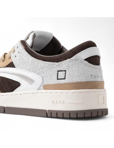 La Torneo Pop White-Brown di D.A.T.E. è una sneakers dal design sportivo e raffinato, realizzata artigianalmente in Italia. La tomaia combina suede effetto hairy bianco e nabuk color cuoio, con dettagli marroni a contrasto che donano personalità e stile urbano. La punta è traforata per garantire maggiore traspirabilità, mentre i lacci in cotone e il logo ricamato lateralmente esaltano l’identità del brand.