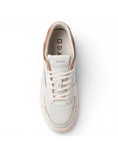 La tomaia in pelle martellata bianca è completata da inserti in suede in tono e dettagli colorati a contrasto. Il collare in pelle color cuoio e il logo laterale D.A.T.E. definiscono l’identità del modello, mentre la punta traforata migliora la traspirabilità. La label in pelle sulla linguetta e il logo quadrato impresso sul tallone rafforzano il posizionamento premium.