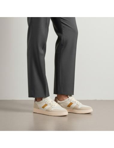La tomaia in nappa color avorio è combinata con inserti in suede tono su tono per profondità materica. La banda laterale in suede senape crea contrasto cromatico controllato, mentre il talloncino in suede color tortora completa l’estetica heritage. Il logo quadrato D.A.T.E. e il branding laterale consolidano il posizionamento premium.