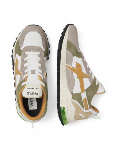 La tomaia in suede e nylon tecnico nelle tonalità verde militare, bianco e beige è arricchita da inserti a contrasto e dall’iconico logo laterale W6YZ color cuoio, che dona personalità al design. La struttura multilayer garantisce leggerezza, resistenza e un look ispirato al mondo running.
