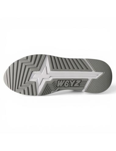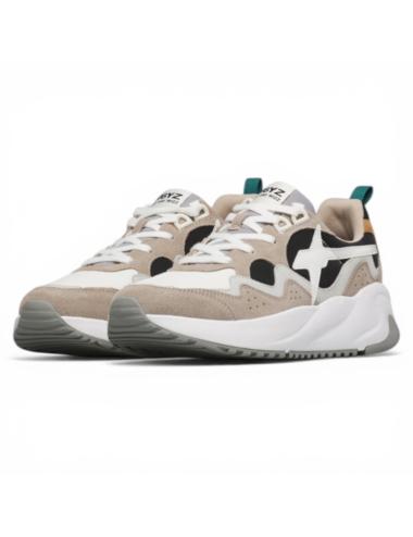 La tomaia in suede e tessuto tecnico traspirante nelle tonalità tortora e bianco è arricchita da inserti a contrasto e dall’iconico logo laterale W6YZ, che dona dinamismo e riconoscibilità al modello. La combinazione di materiali garantisce leggerezza, resistenza e un’estetica moderna adatta all’utilizzo quotidiano.