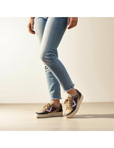 Le sneakers Kyle sono una rivisitazione audace del concetto di calzatura casual, pensata per chi vuole distinguersi con dettagli unici e fuori dagli schemi. Realizzate in morbida pelle color cammello, si arricchiscono di inserti glitter bordeaux che donano luminosità e carattere, abbinati ad un laccio leopardato che esalta lo spirito fashion e ribelle del modello.