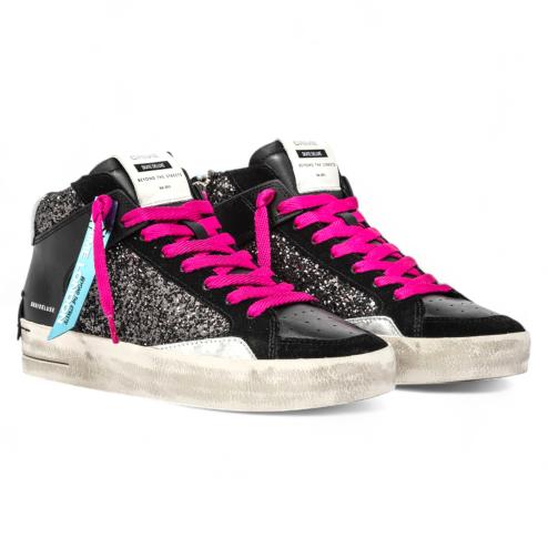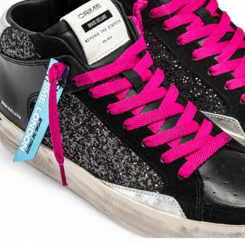 Le SK8 Deluxe Mid Party Girl sono pensate per chi vuole brillare con stile. Il glitter nero, i dettagli in pelle argentata e i lacci fucsia accesi trasformano queste sneakers in un modello unico e audace, perfetto per outfit glamour e serate speciali.