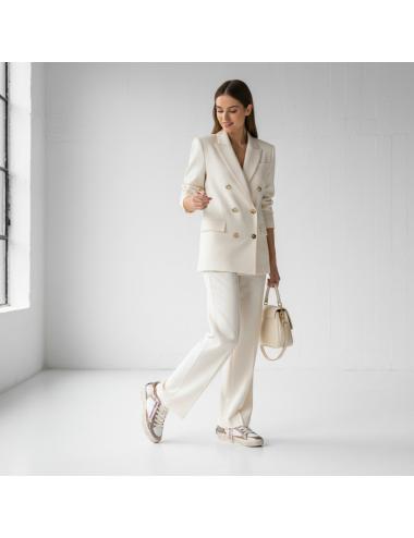 All’interno, fodera in pelle e tessuto per comfort continuativo. La suola in ecopelle fasciata panna, con altezza di circa 2,5 – 3 cm e fondo miele, garantisce stabilità, grip e coerenza cromatica con il mood luxury-casual del modello.
