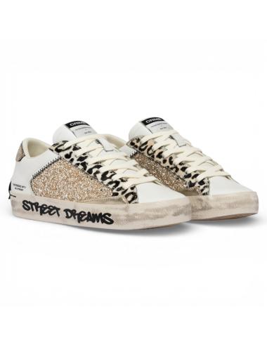 La tomaia in pelle bianca con glitter oro è valorizzata da dettagli in lamina platino per un contrasto luxury. Il talloncino in cracklé platino, la linguetta in pelle bianca con label logata in tessuto e il patch posteriore in pelle nera rafforzano il branding. I lacci bianchi in cotone mantengono il look pulito, mentre la grafica laterale “Street Dreams” spinge l’identità fashion.