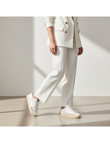 La tomaia in pelle bianca è valorizzata da inserti in glitter argento su punta e tallone per un contrasto luminoso ma portabile. La linguetta in pelle bianca con label logata e il patch posteriore in pelle nera rafforzano l’identità di brand. I lacci bianchi mantengono il profilo pulito e versatile.