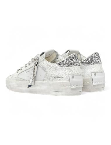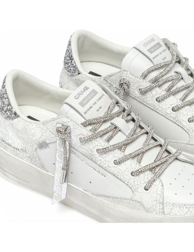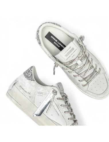 Sneakers basse da donna in pelle bianca, inserti in pelle con finitura crack, inserto sul tallone glitter argento, dettagli in pelle scamosciata bianca, lacci tubolari rivestiti con brillantini color argento, plantare removibile in lattice rivestito in pelle, para in gomma bianco avorio "effetto vintage", interno in spugna di cotone. In dotazione doppio laccio colore bianco.