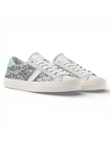 La sneaker D.A.T.E. Hill Low Glitter Silver è una low-top premium Made in Italy con posizionamento fashion-casual ad alto impatto visivo. Il mix tra glitter argento e camoscio bianco la rende un modello statement, perfetto per elevare outfit quotidiani e look urban-chic.