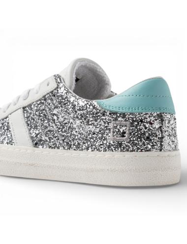 La tomaia in glitter argento è bilanciata da inserti in pelle liscia bianca e dettagli in camoscio. Il talloncino posteriore in pelle azzurra introduce un contrasto cromatico fresco e riconoscibile, mentre la linguetta in pelle con logo D.A.T.E. e il codice laterale ricamato rafforzano l’identità premium del brand.