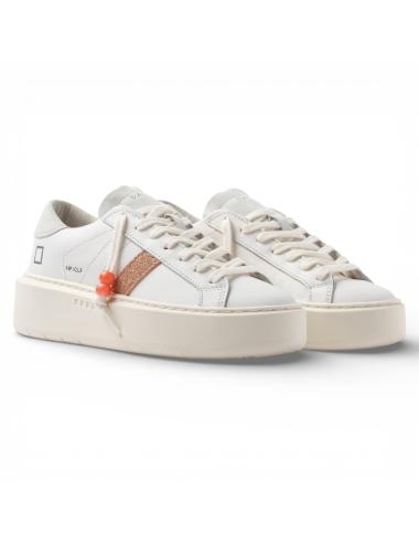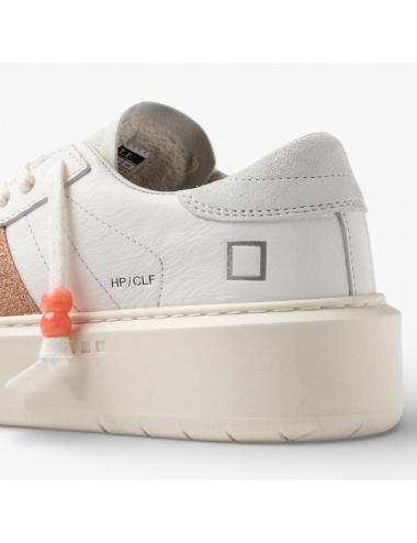 La tomaia in pelle bianca è valorizzata dalla banda laterale in glitter color rame e dal talloncino posteriore in suede tono su tono. La linguetta in pelle e camoscio con logo D.A.T.E. impresso rafforza il posizionamento premium, mentre i lacci in cotone con perline decorative aggiungono un dettaglio distintivo e riconoscibile.