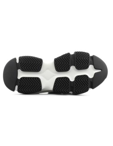 Sneakers donna modello running, tomaia in tessuto tecnico nero, para running in gomma rialzata 5 cm colore bianco, logo posteriore gommato bianco in rilievo, lacci tubolari in tessuto tono su tono, plantare morbido, suola in gomma antiscivolo.