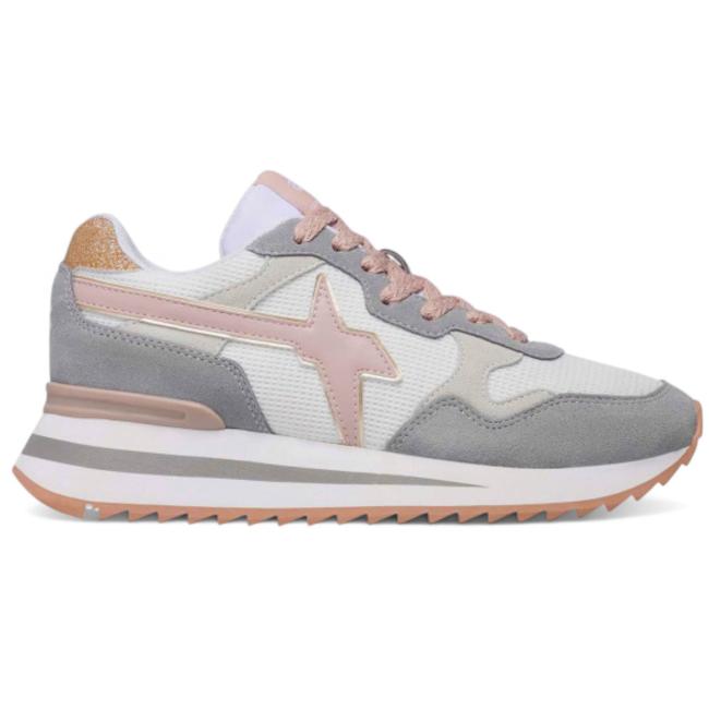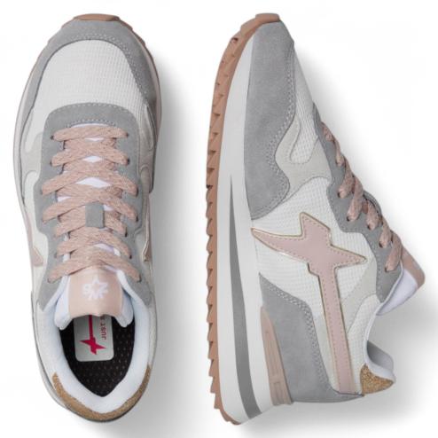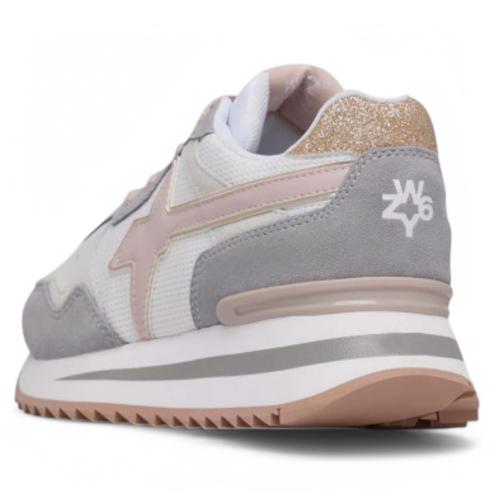 Le W6YZ Yak-M sneakers running donna sono l'alleato perfetto per chi cerca stile, comfort e performance in un unico paio di scarpe. Realizzate in tessuto lurex bianco, con eleganti inserti in pelle scamosciata grigia e rosa, offrono un look moderno e sofisticato.